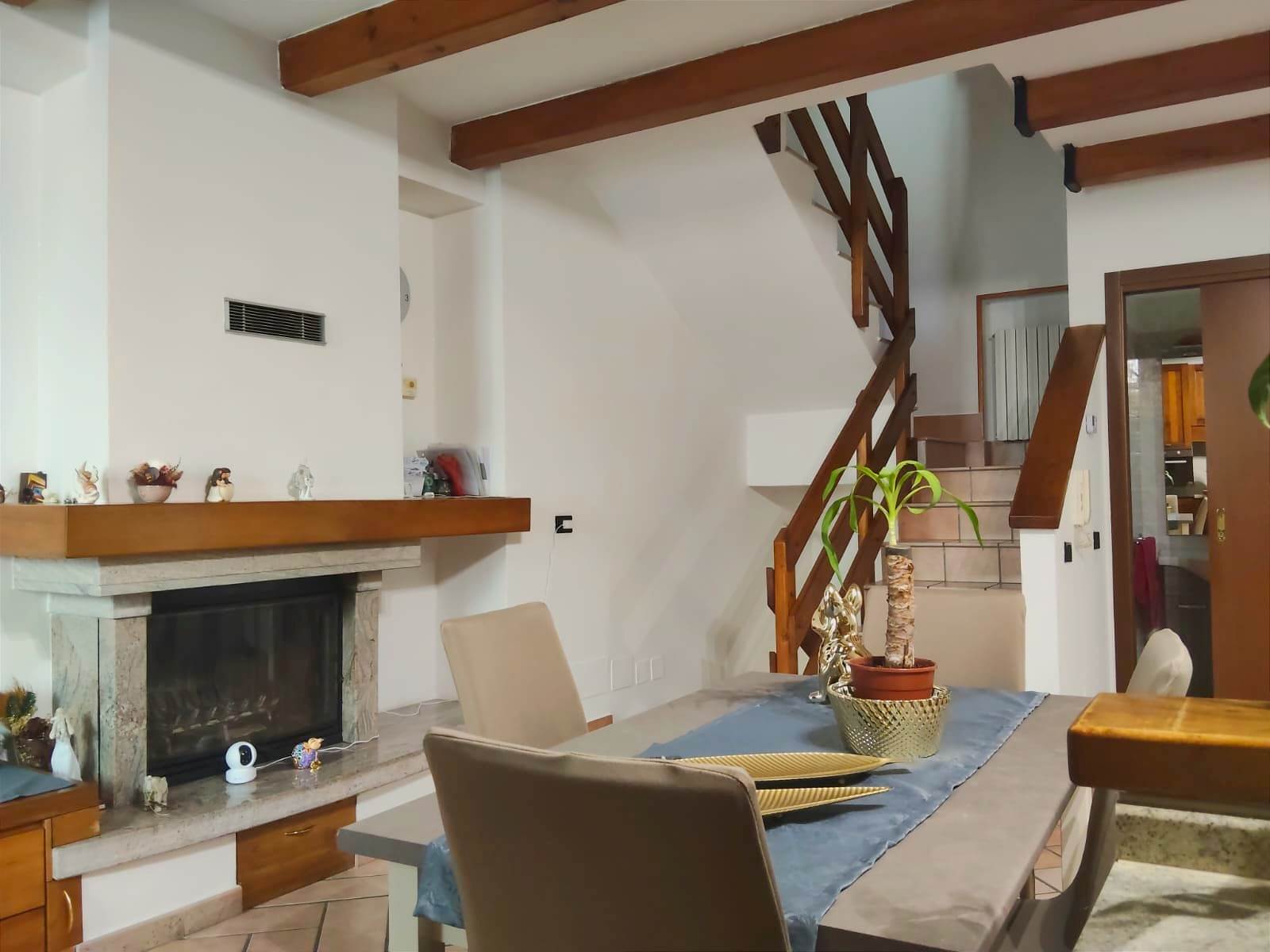 Al primo piano si sviluppa la zona giorno con cucina a vista e pratico bagno di servizio, oltre a un balcone che dona aria e luce all’ambiente. Il soggiorno presenta un pratico camino ventilato a legna