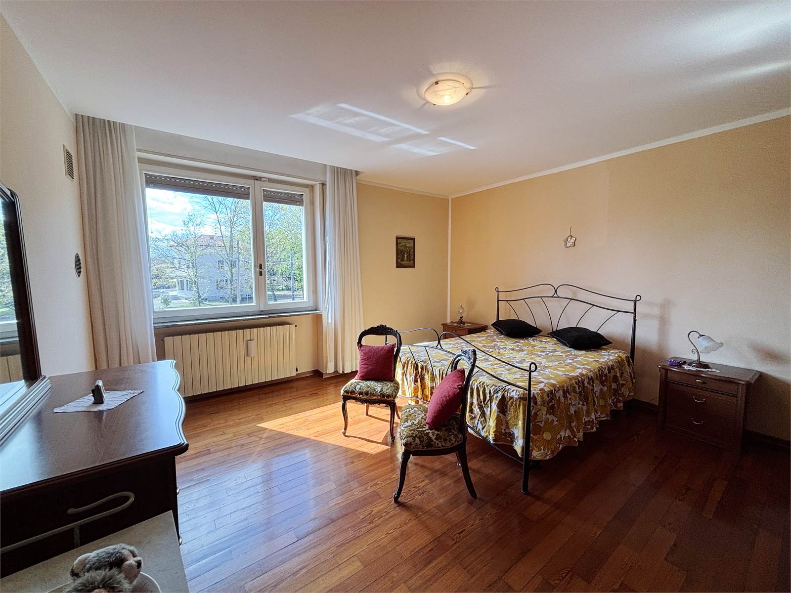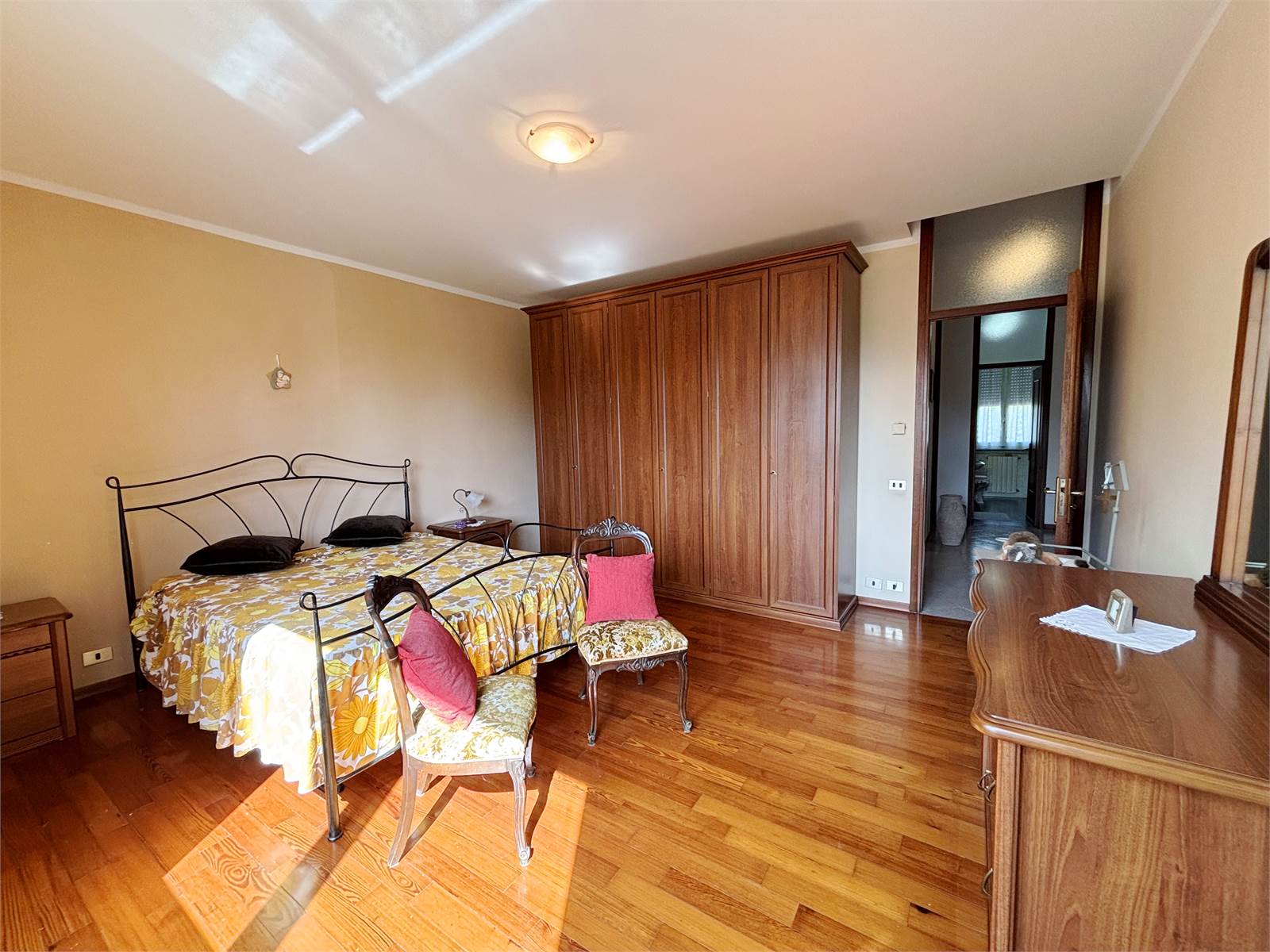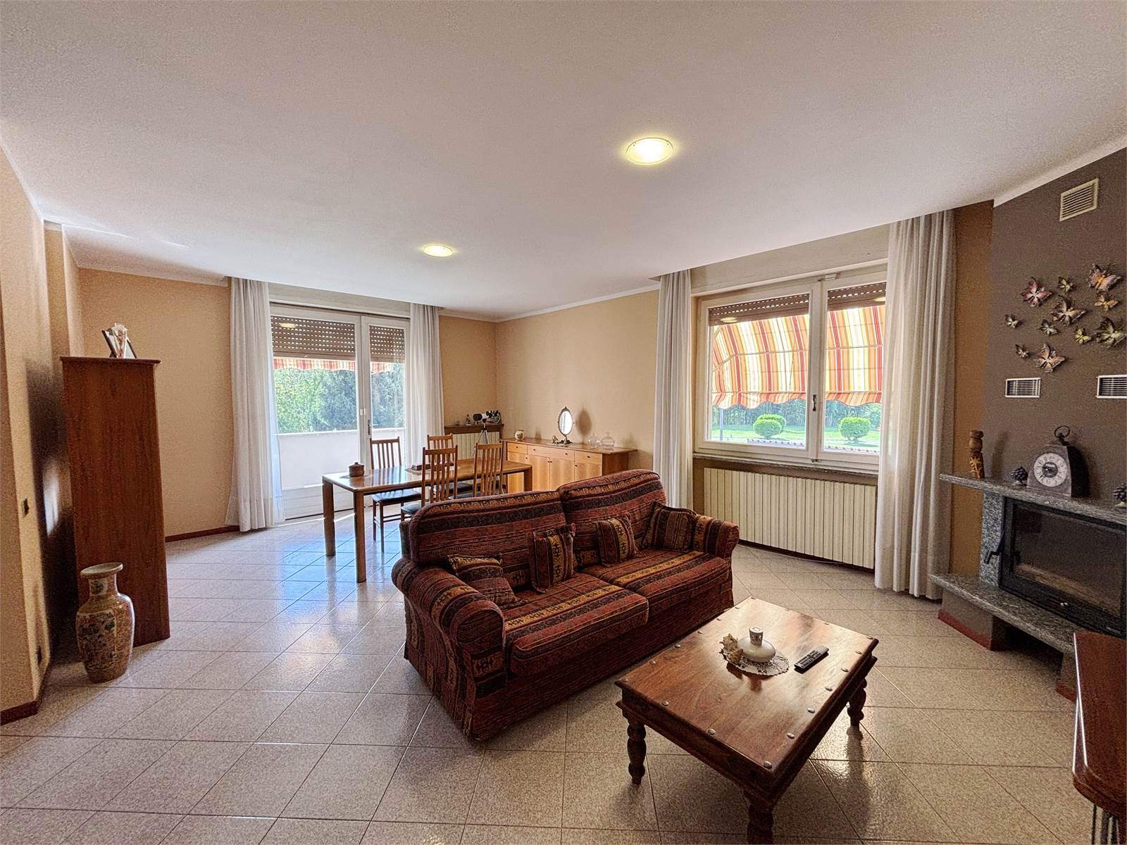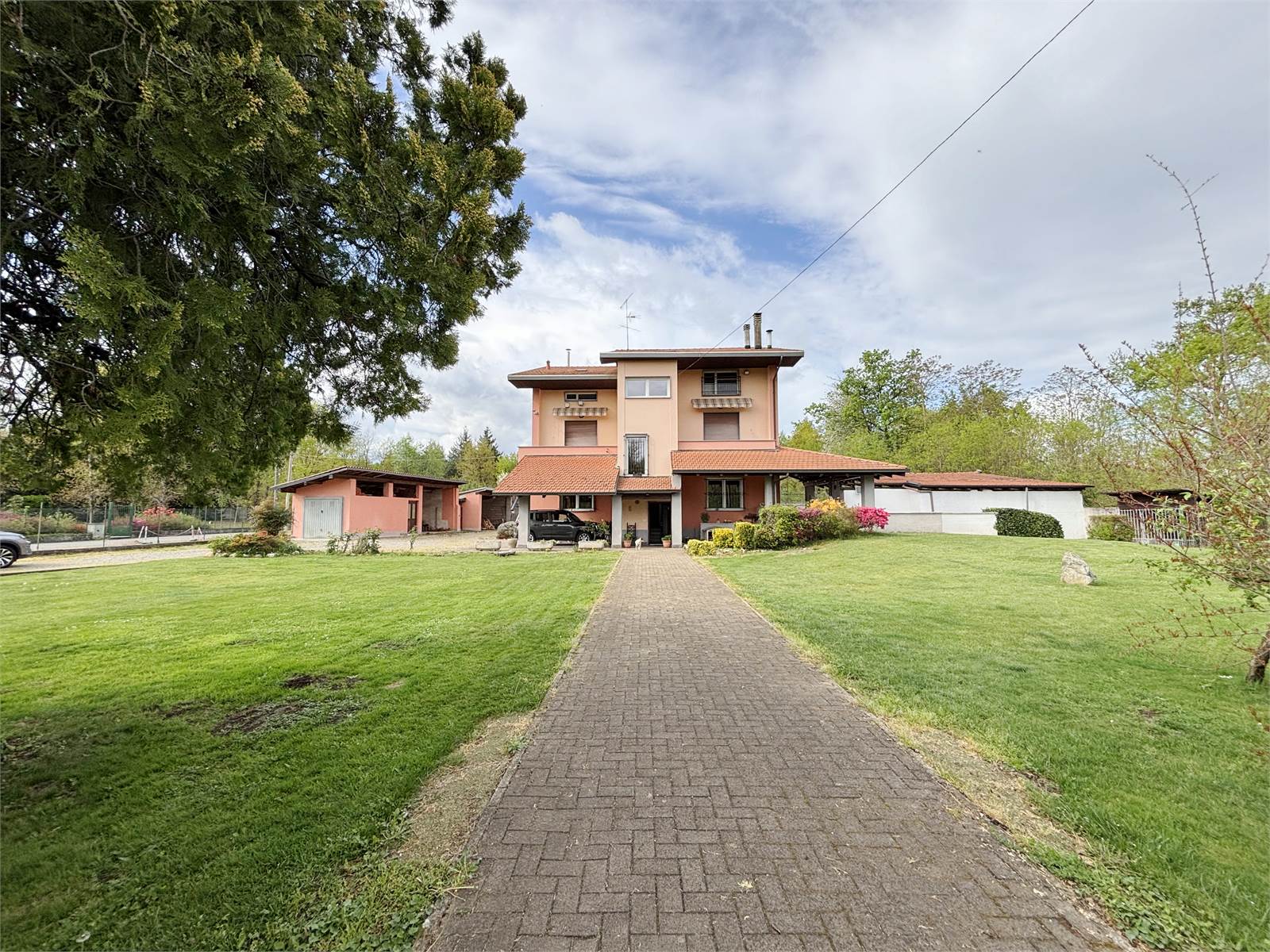 Attraverso un vano scala finestrato si accede al primo piano, dove si sviluppa il secondo appartamento di circa 130 mq. L’ingresso conduce a un ampio soggiorno con camino ventilato e canalizzato fino alla camera matrimoniale, cucina abitabile anch’essa dotata di camino, entrambi con uscita su balcone. La zona notte offre due camere matrimoniali con pavimento in parquet, una cameretta e doppi servizi, oltre a un pratico ripostiglio/locale caldaia. Questo appartamento dispone di serramenti in PVC e caldaia a condensazione del 2016.