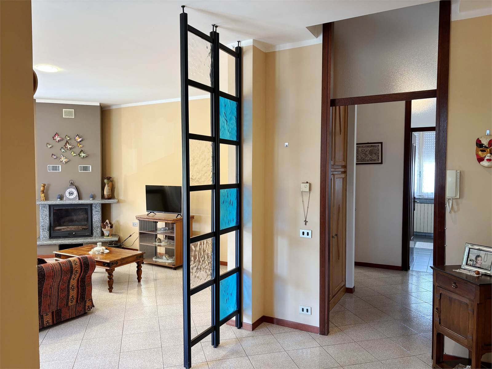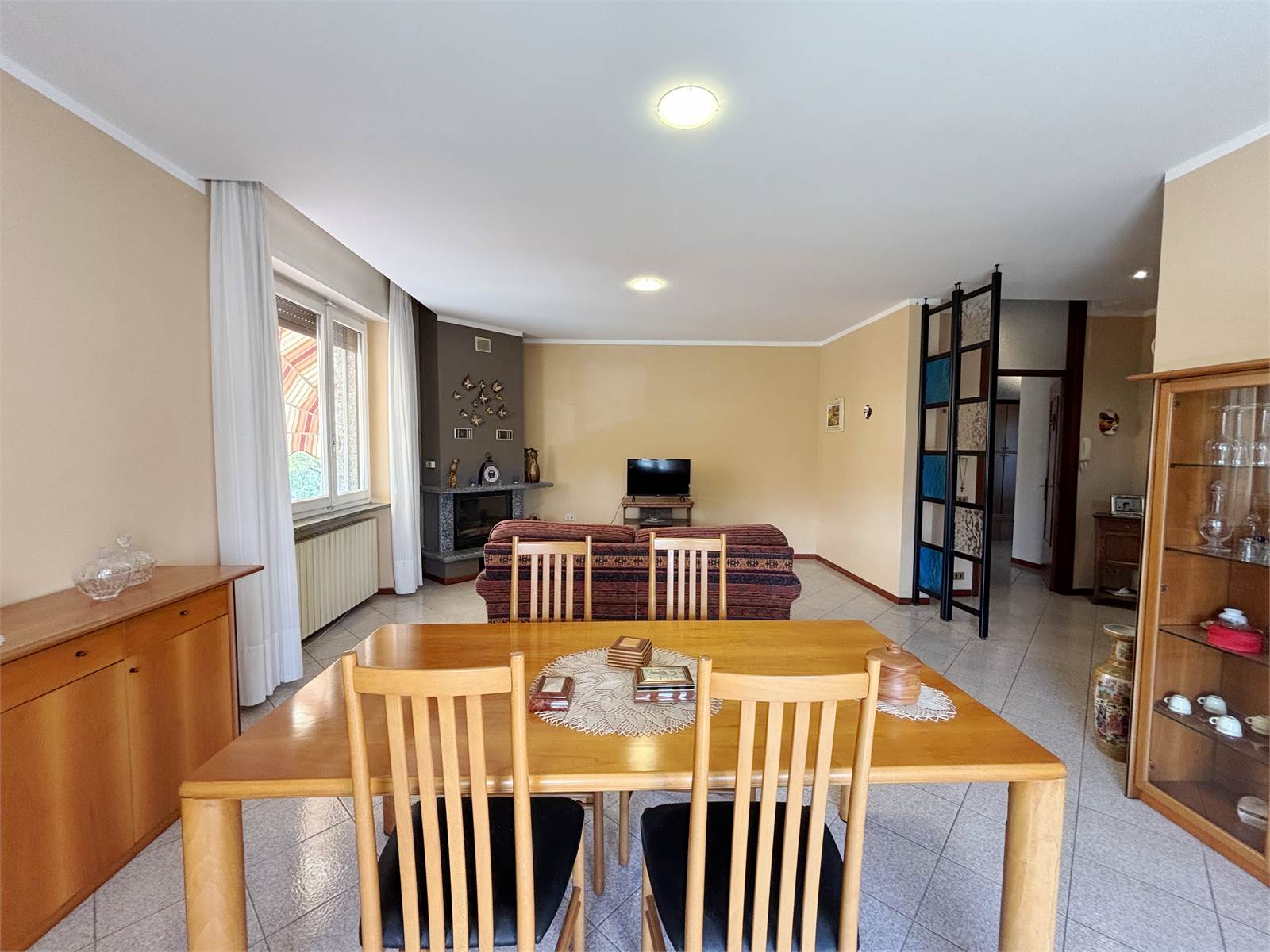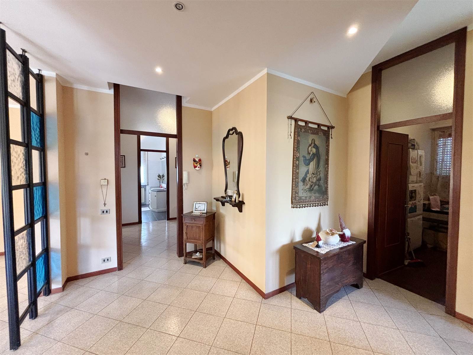 Attraverso un vano scala finestrato si accede al primo piano, dove si sviluppa il secondo appartamento di circa 130 mq. L’ingresso conduce a un ampio soggiorno con camino ventilato e canalizzato fino alla camera matrimoniale, cucina abitabile anch’essa dotata di camino, entrambi con uscita su balcone. La zona notte offre due camere matrimoniali con pavimento in parquet, una cameretta e doppi servizi, oltre a un pratico ripostiglio/locale caldaia. Questo appartamento dispone di serramenti in PVC e caldaia a condensazione del 2016.