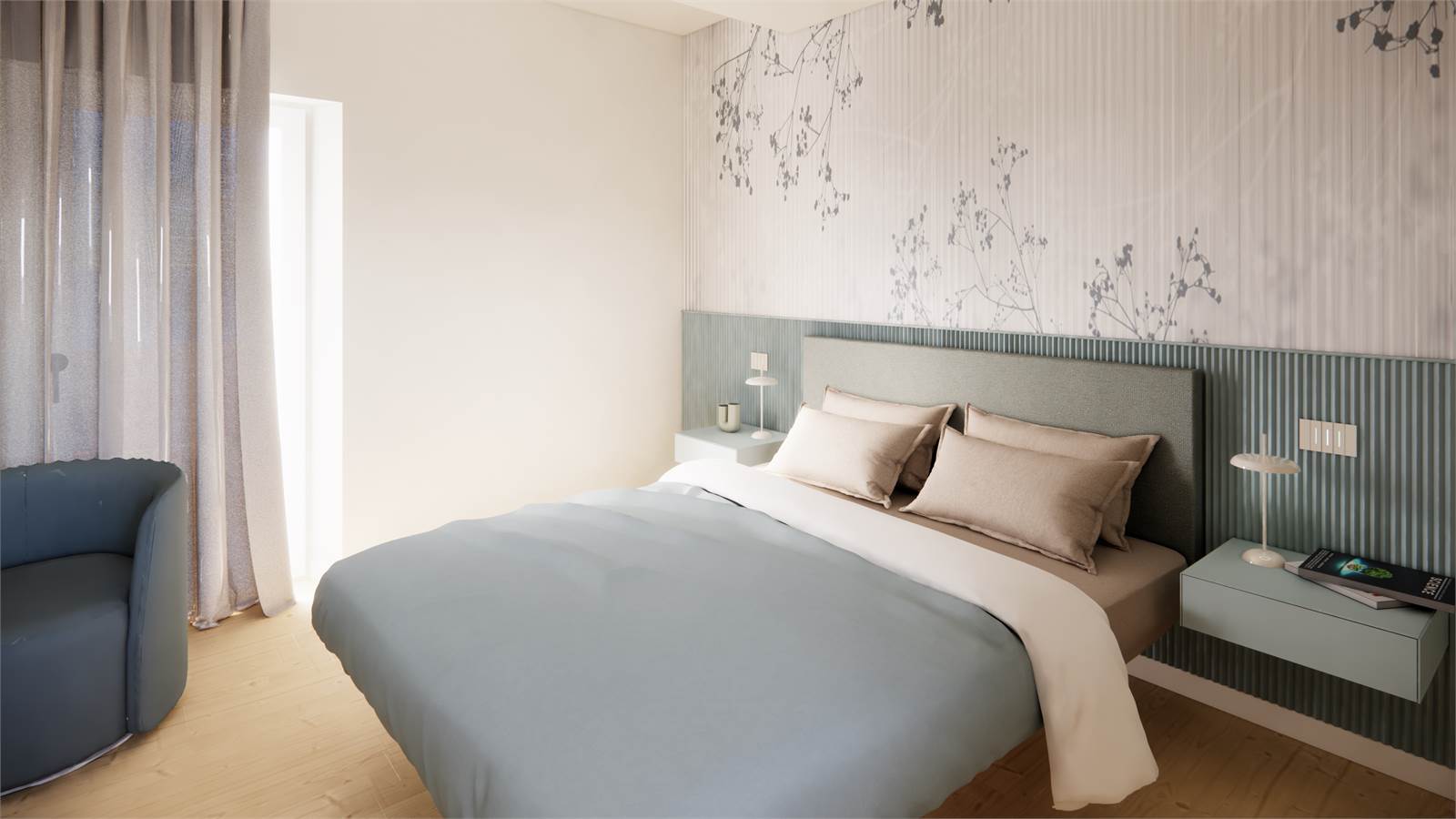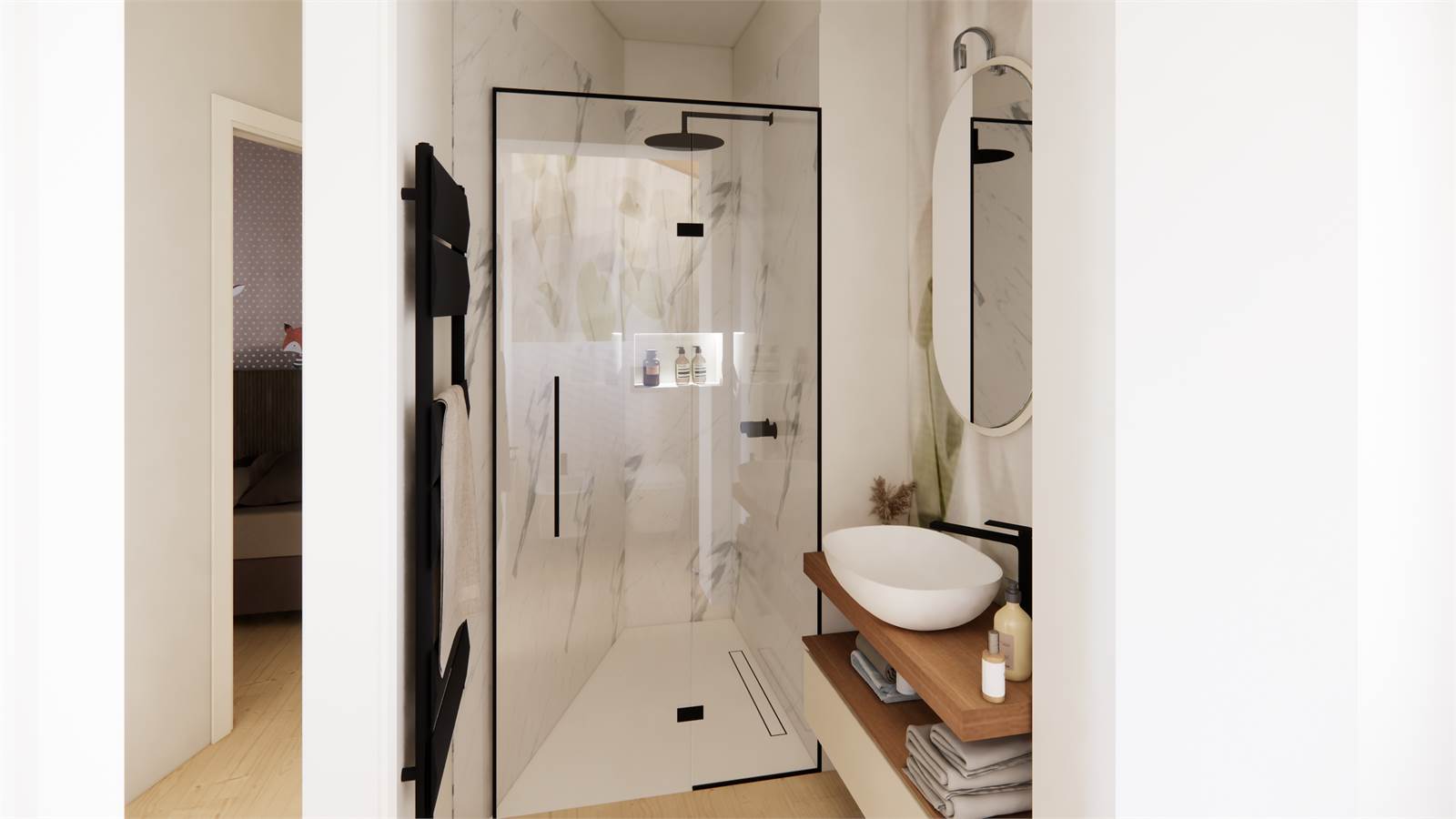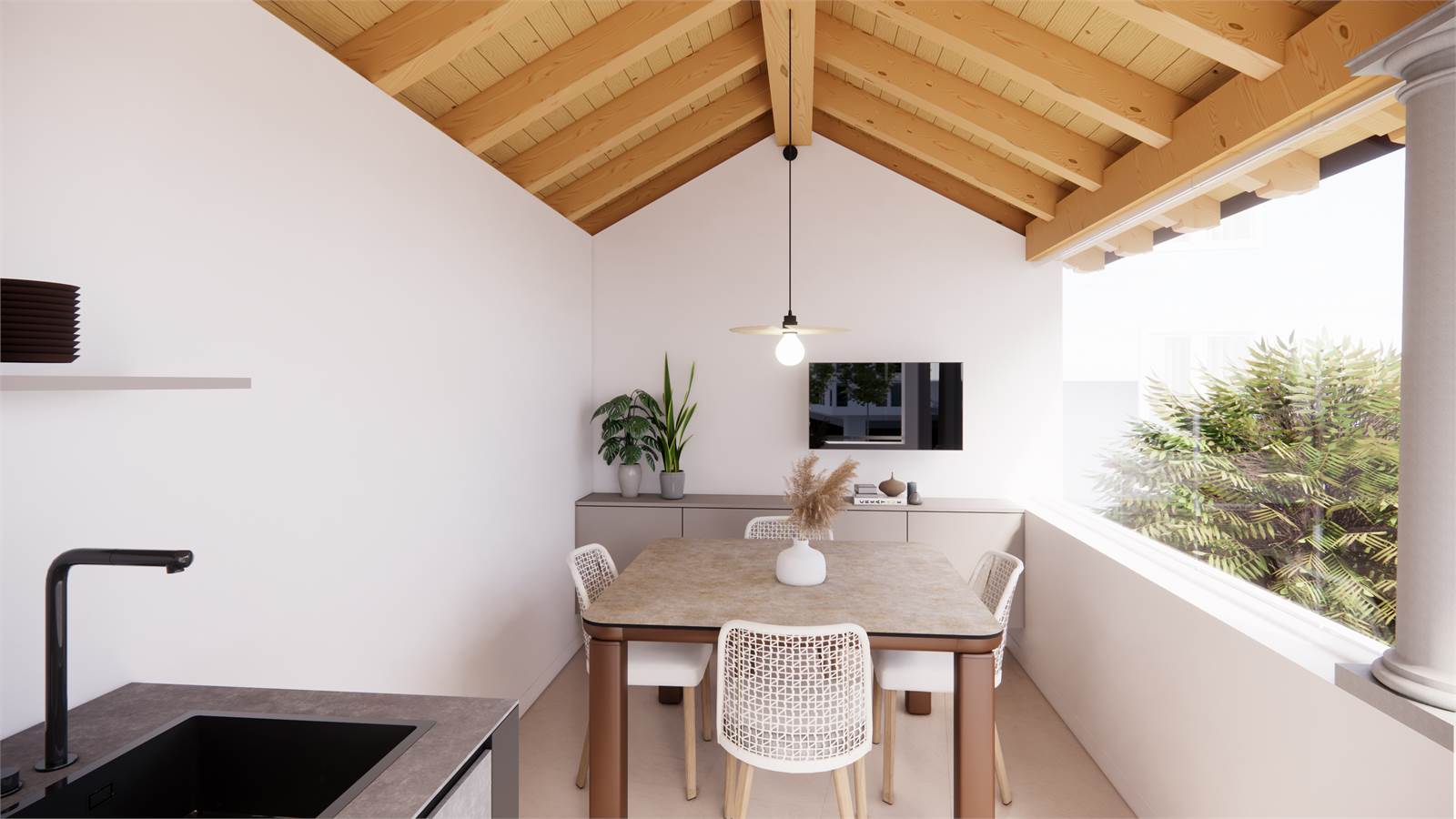 -Primo piano: zona giorno con cucina a vista, con accesso diretto ad un ampio terrazzo con vista panoramica, disimpegno, secondo bagno, camera matrimoniale con cabina armadio.