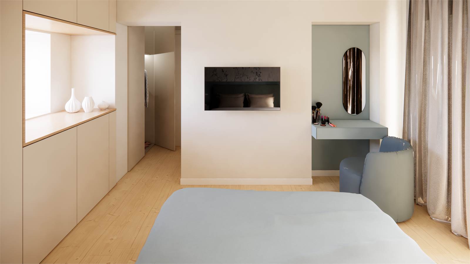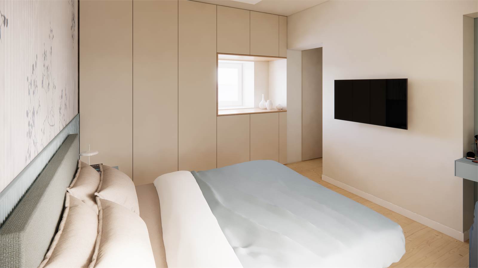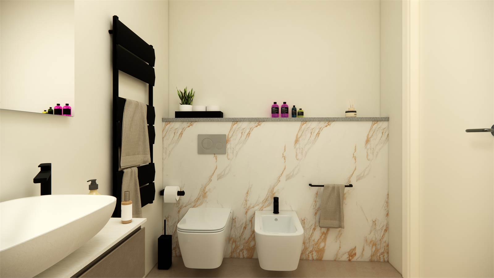 -Primo piano: zona giorno con cucina a vista, con accesso diretto ad un ampio terrazzo con vista panoramica, disimpegno, secondo bagno, camera matrimoniale con cabina armadio.