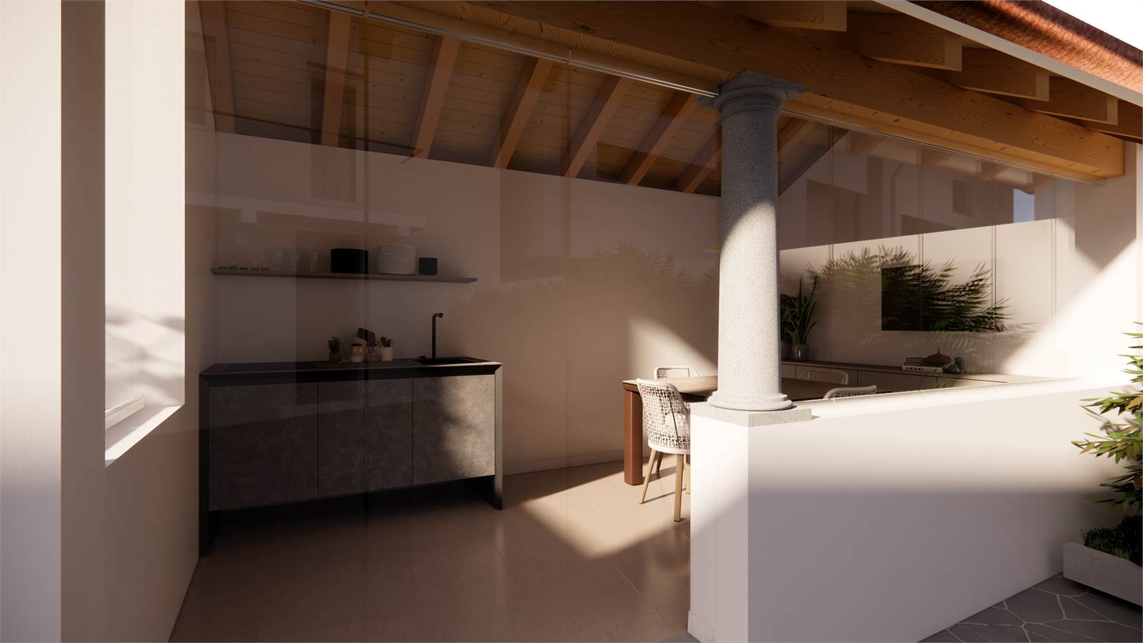 Completano la proprietà un porticato con basculante elettrica adibito a box con 2 posti auto, un secondo porticato indipendente che può essere adibito a locale hobby.
